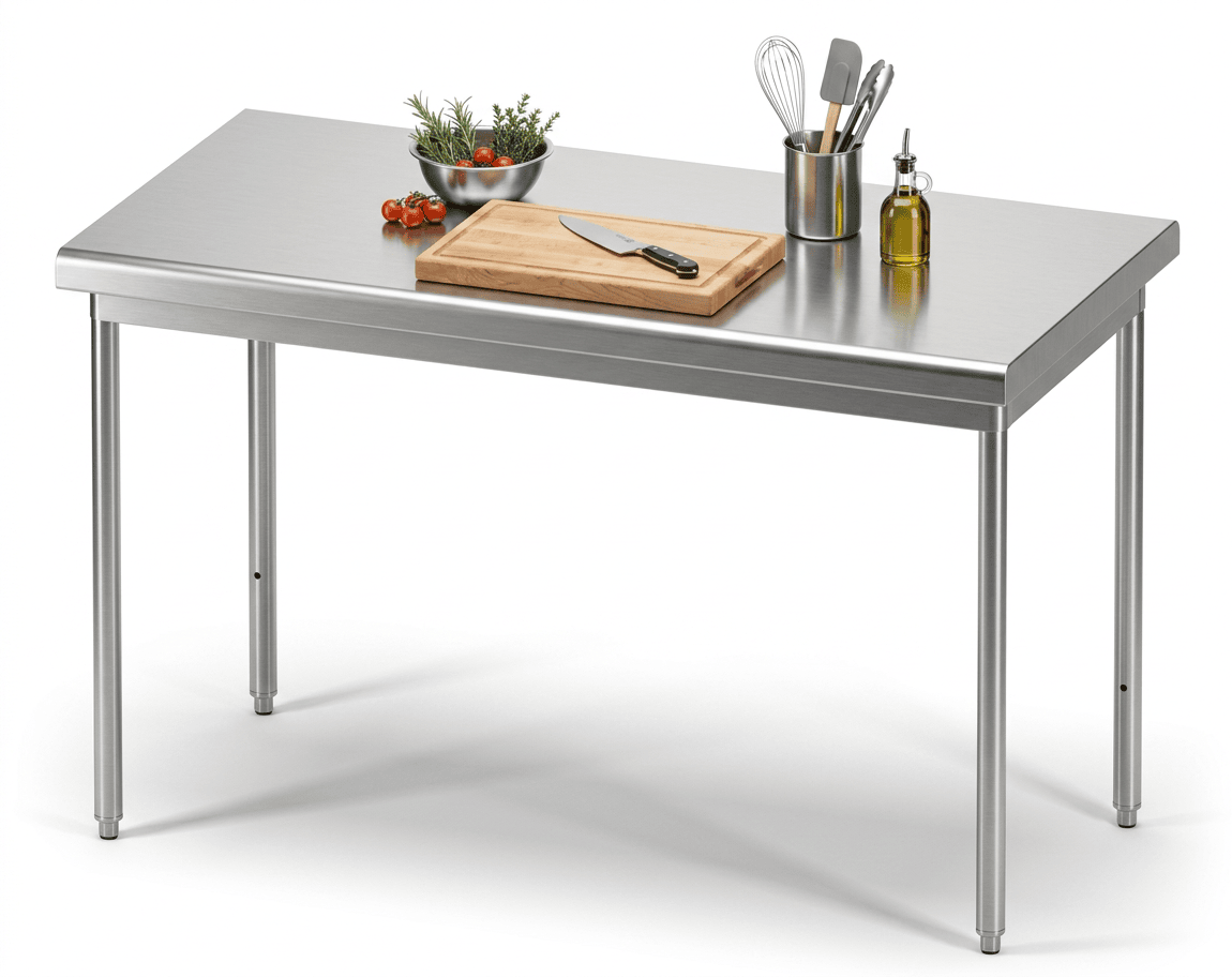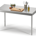 Table démontable standard en Inox AISI 304L à bords rayonnés sur vérins ABS avec ou sans dosseret, avec ou sans étagère basse et équipée du système Turn’fix pour un montage plus rapide, plus facile et plus robuste.